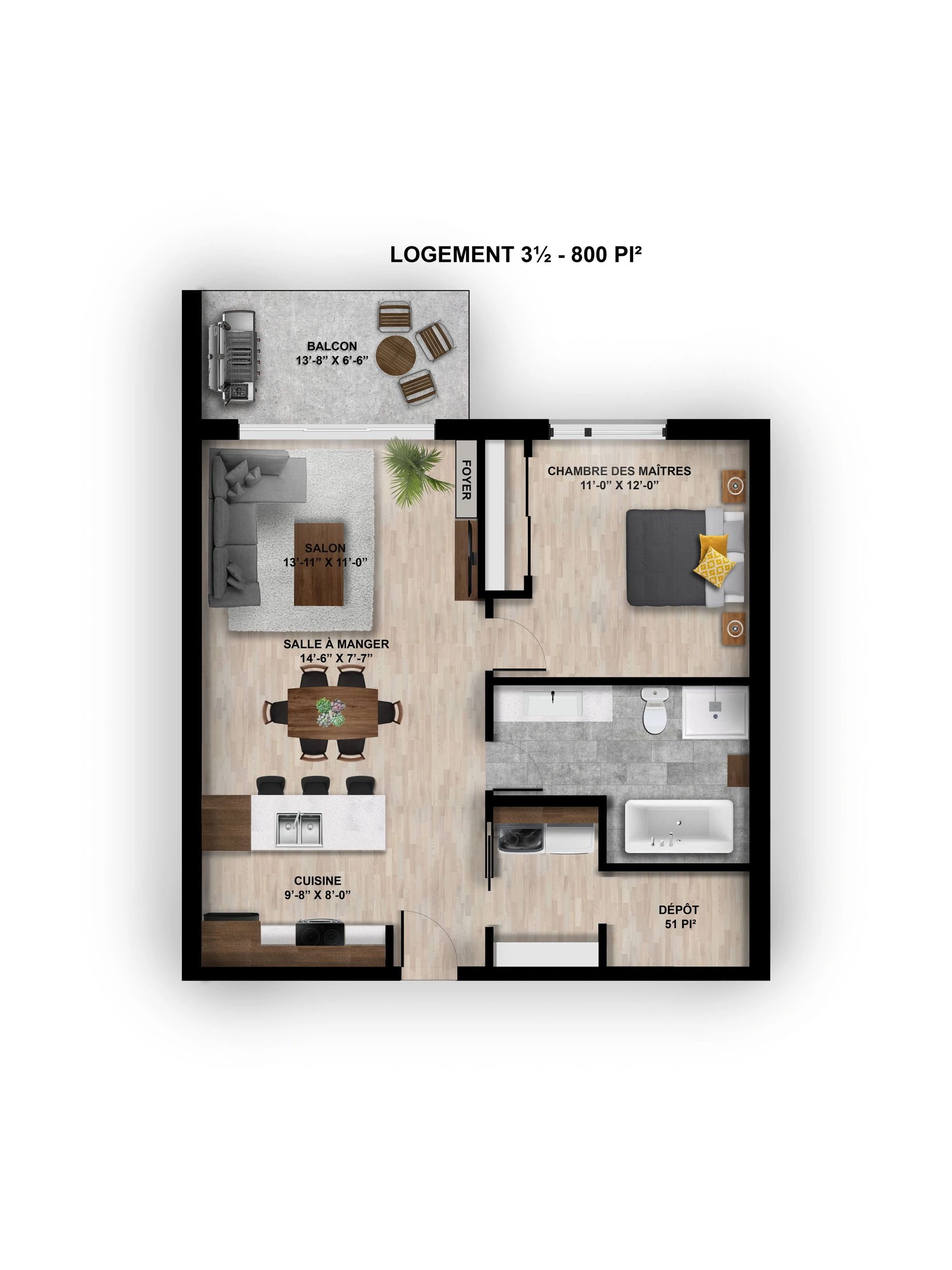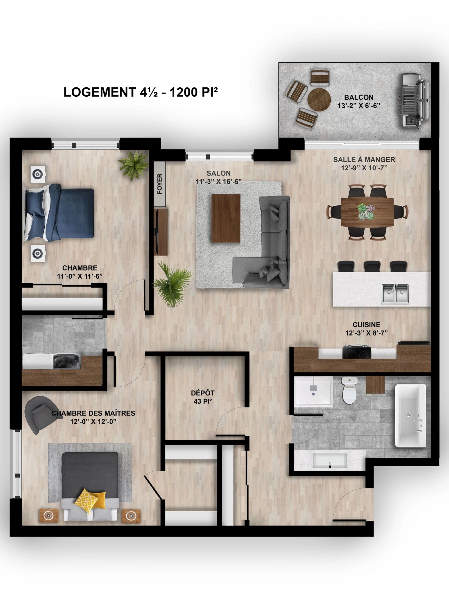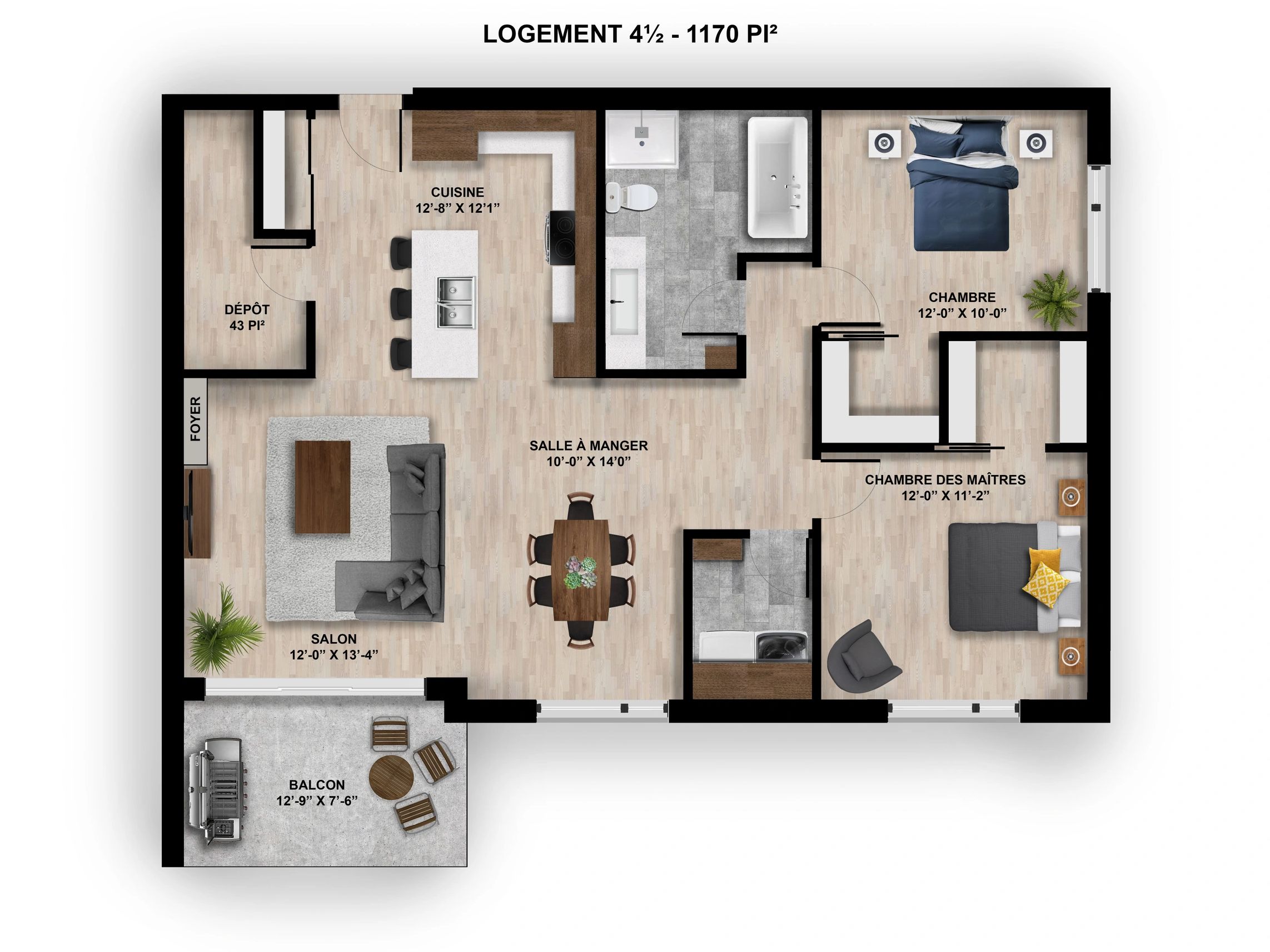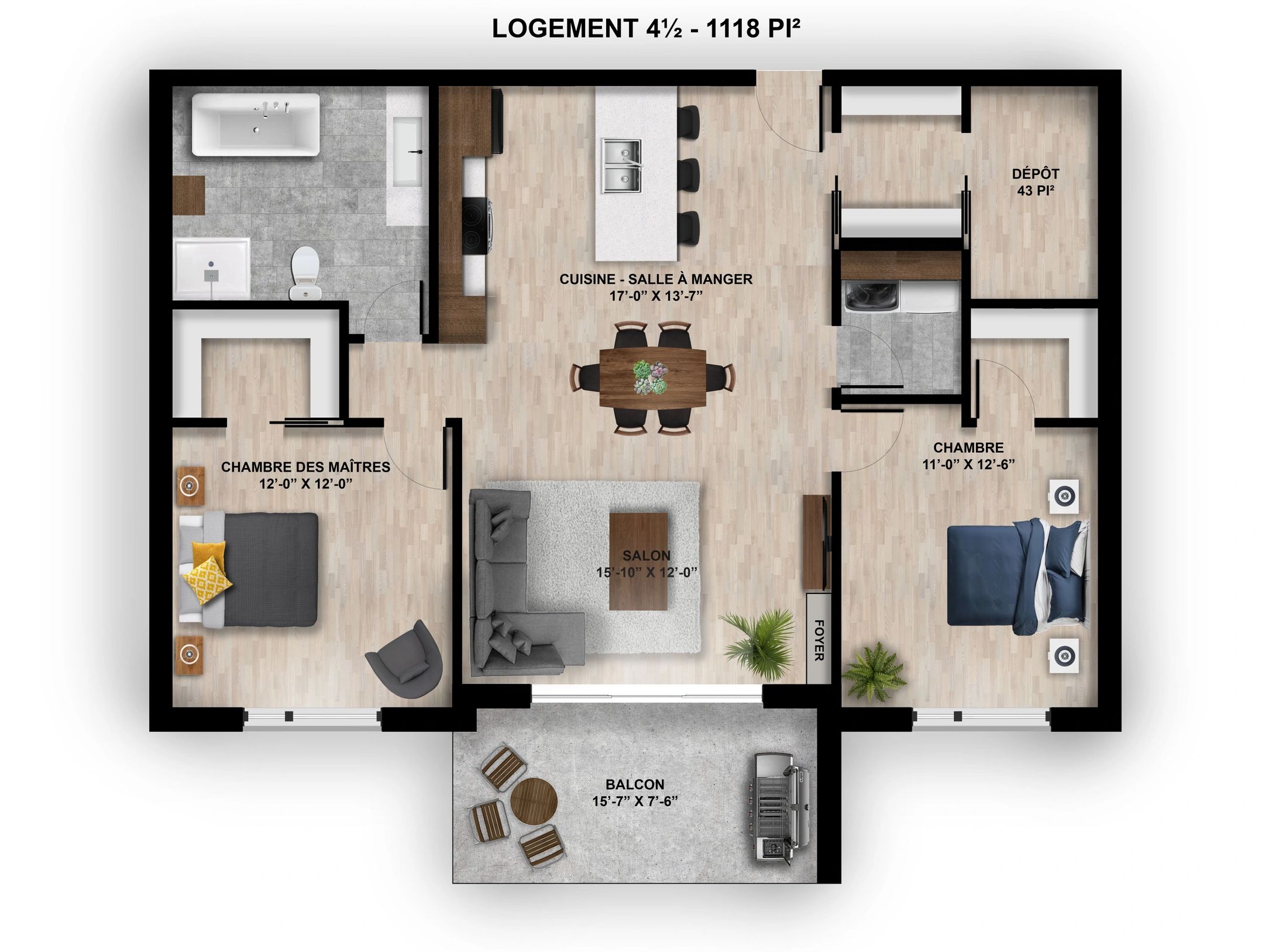 Nos spacieux 4 1/2 avec foyer électrique de 60 pouces. Unité de centre de 1118 pieds carrés